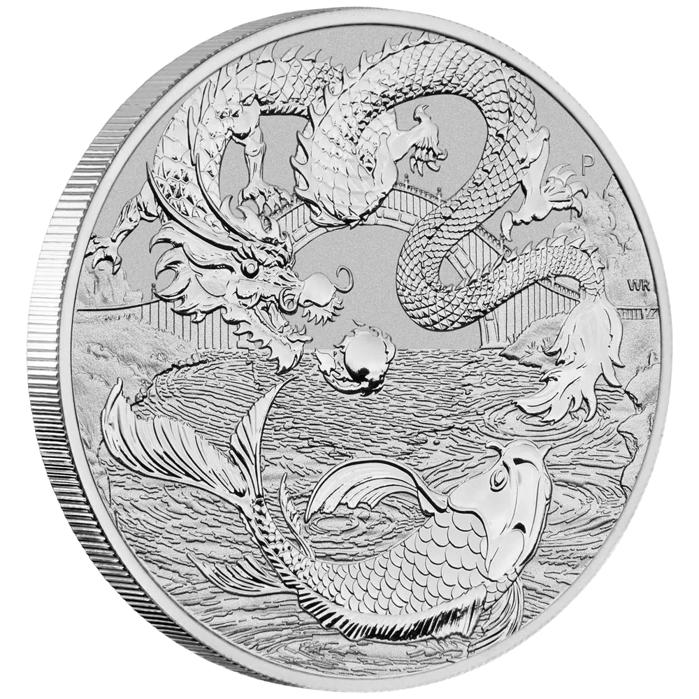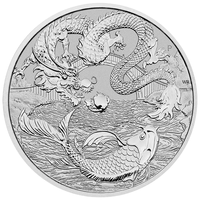 The Perth Mint. Design mince vyobrazuje mocného čínského draka a kapra koi kroužícího
