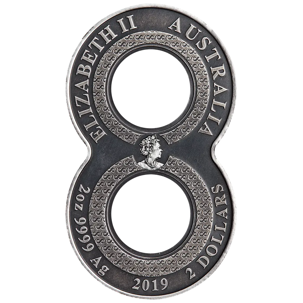 Tato mince typu Figure Eight (ve tvaru osmičky) byla vyražena australskou mincovnou Perth Mint