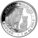pro africkou savanu. Součástí designu jsou i nápisy „AFRICAN WILDLIFE”, „LEOPARD” a „1 oz Ag 999,9″.