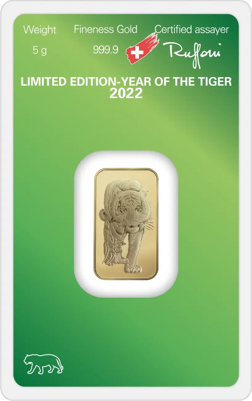 Investiční zlato – zlatý slitek 5g Argor Heraeus SA Year of the Tiger (Rok tygra) 2022 Limited Edition